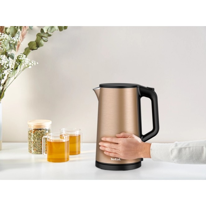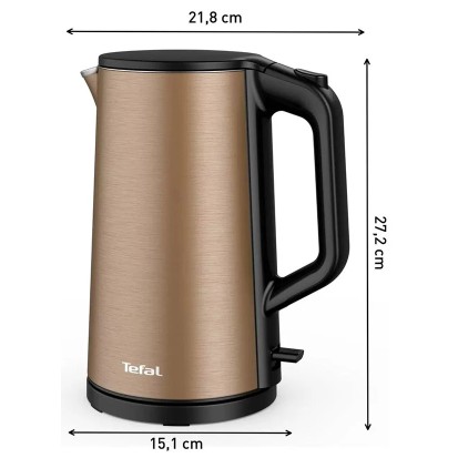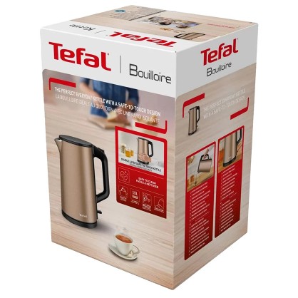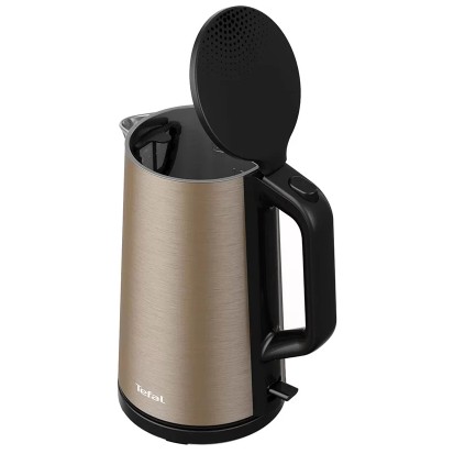 Модель привертає увагу своїм вишуканим дизайном. Крім елегантних мінімалістичних форм і оригінального колірного рішення, електрочайник TEFAL KI583C10 вигідно відрізняють і технічні характеристики. Пристрій виконаний у високоякісному двошаровому корпусі. Якщо порівнювати цю конструкцію з традиційними аналогами, можна переконатися, що електричний чайник з подвійними стінками має кращу теплоізоляцію і вищий рівень безпеки (виключається ризик опіку при дотику до корпусу). Об’єму TEFAL KI583C10 достатньо, щоб за один сеанс закип’ятити воду на 5-6 чашок напою (1,5 л). Висока потужність (2 кВт) дозволяє зробити це за 3-4 хвилини. Зручний механізм кришки забезпечує просте та швидке наповнення ємності, а знімний фільтр захищає від попадання накипу. Прилад комплектується знімною базою-підставкою із прихованим нагрівальним диском. Для зручності чайник Tefal оснащений захистом від увімкнення без води та світловим індикатором.