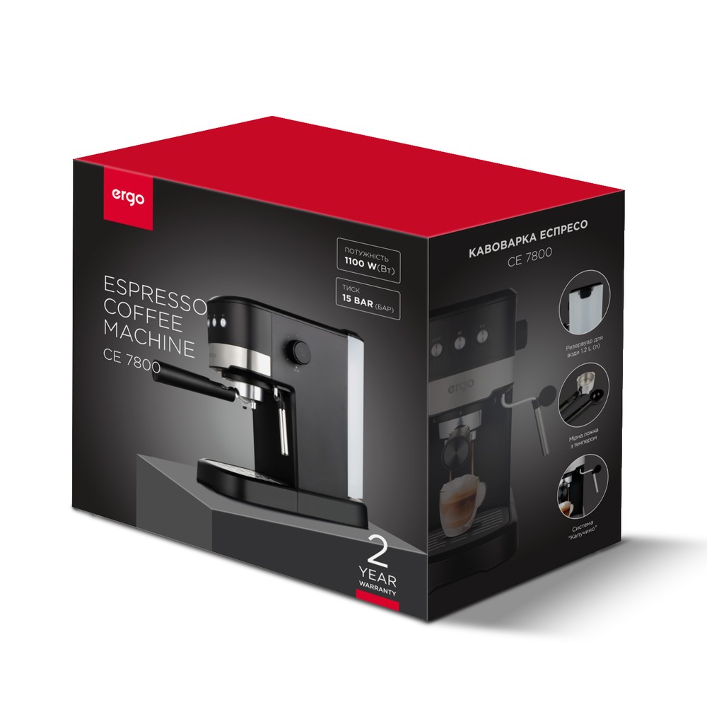 Разом із кавоваркою ERGO CE 7800 в комплект поставки входить також насадка-капучинатор, мірна ложка-темпер і докладна інструкція. Дворічна гарантія на цю модель є відмінним підтвердженням її високої якості.