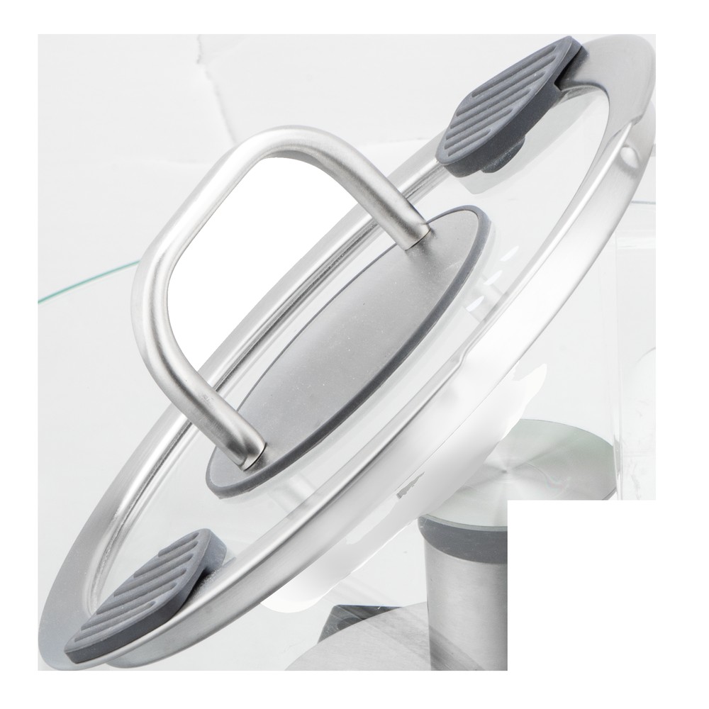- Кришка з термостійкого скла із силіконовими вставками й отвором для зручного зливу рідини