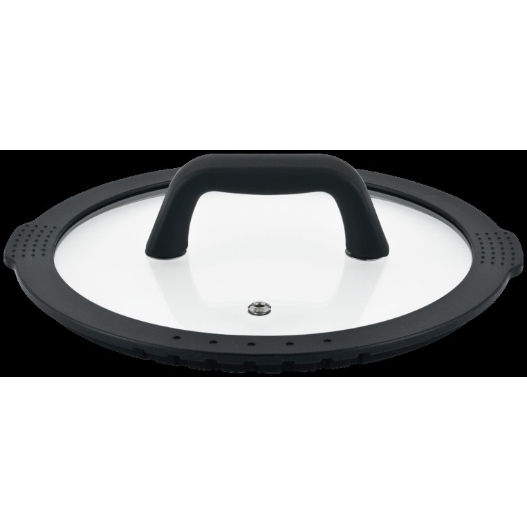 - Кришка з термостійкого скла із силіконовим обідком і виступами для тримання в руках