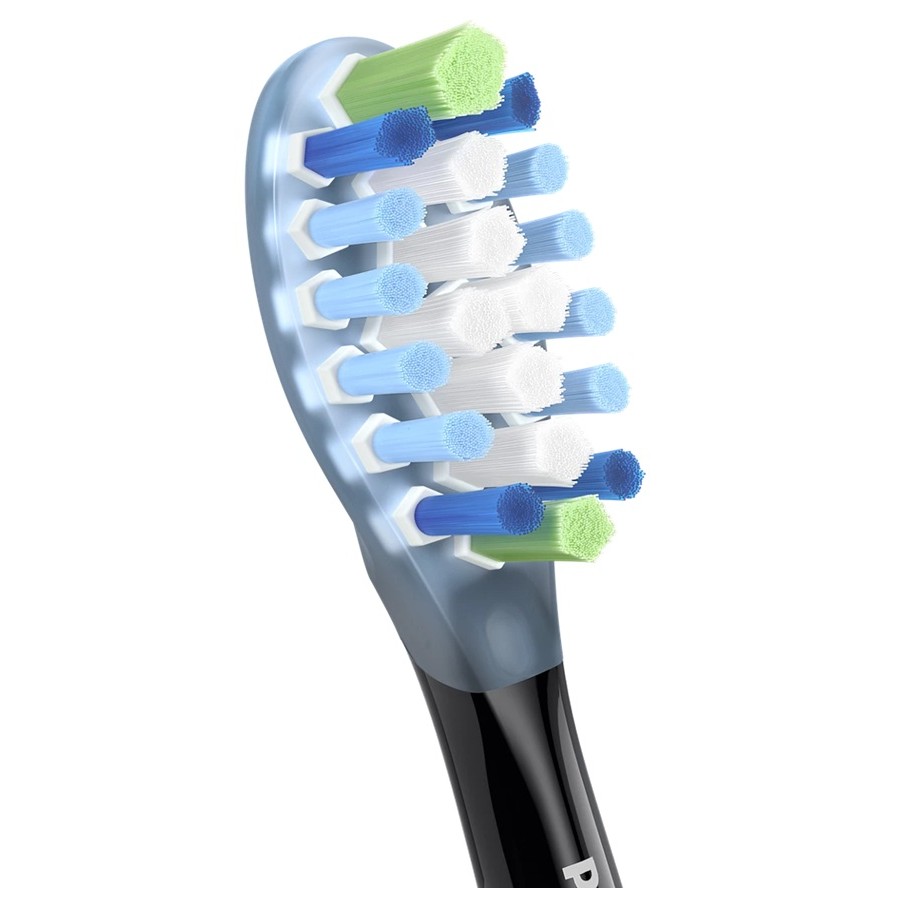 Для глибокого очищення насадка має густі, жорсткі щетинки у центрі, які розташовані у формі п’ятикутника. Вони відбілюють і полірують ваші зуби, забезпечуючи до 100% більше видалення плям лише за три дні.***