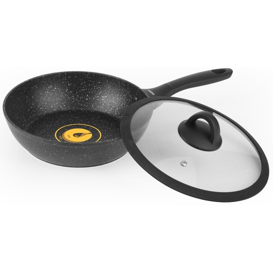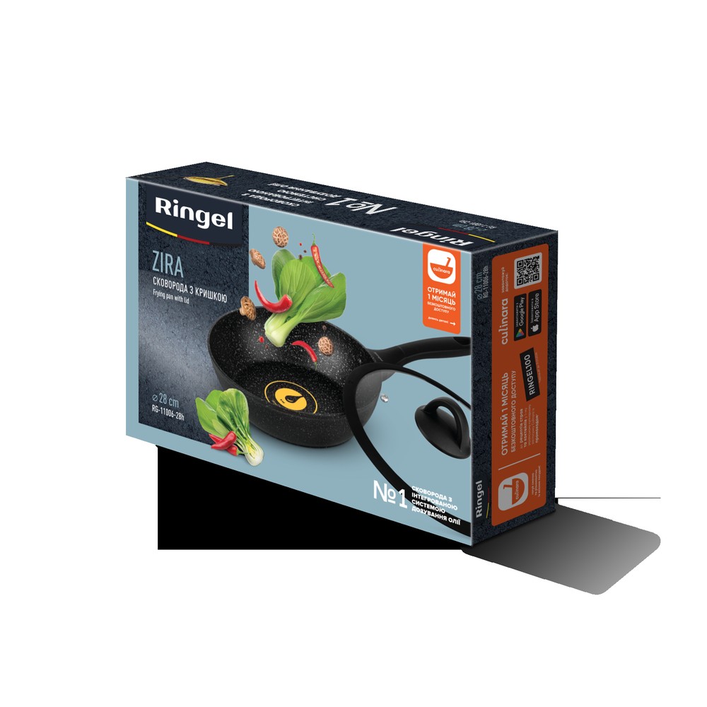 Сковорода з кришкою Zira від Ringel – це відмінний варіант як для приготування страв із соусів, самих соусів і тушкування, завдяки високим бортикам, так і прекрасний посуд для розігрівання. Виготовлені з високоякісного кованого алюмінію, дані сковороди є міцним посудом зі швидким і рівномірним нагріванням. Дно сковорідок цієї серії має додаткове потовщення до 3,2 мм. У даній серії використовується надстійке тришарове антипригарне покриття, що дозволяє використовувати менше олії при приготуванні.