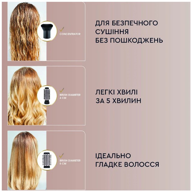 | Насадки | 2 щітки з натуральною щетиною (40 та 50 мм), насадка для попереднього сушіння |