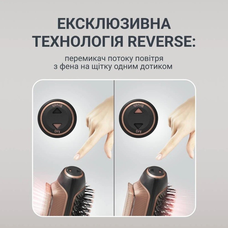 Ексклюзивна технологія Reverse, що дозволяє перемикати потік повітря з фену на щітку одним дотиком