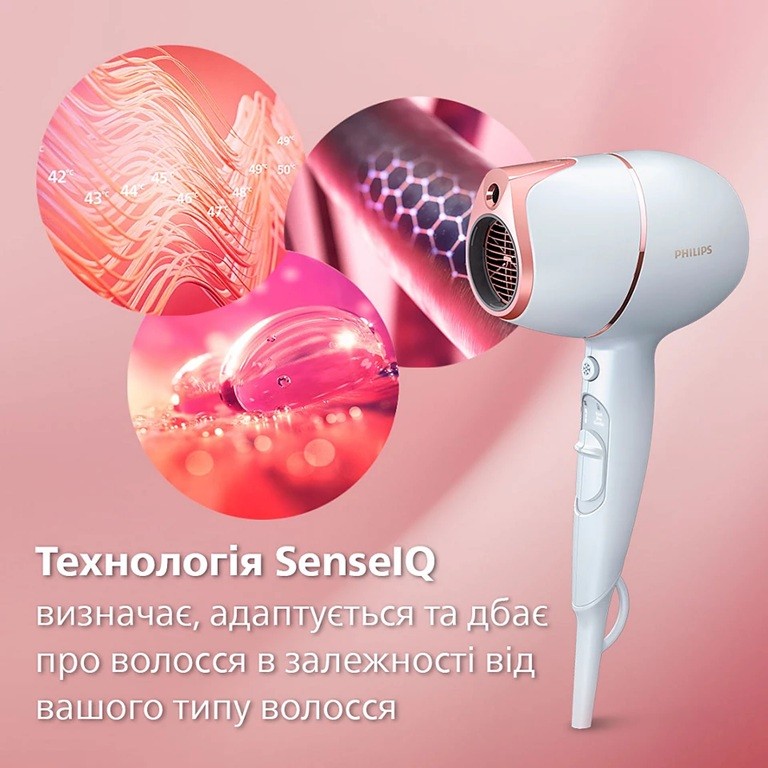 Технологія SenseIQ для персоналізованого сушіння волосся. ВИМІРЮЄ. Інфрачервоний сенсор фену постійно сканує температуру вашого волосся для персоналізованого захисту. АДАПТУЄ. Сенсор адаптує температуру сушіння до 4000 разів за сеанс*** та запобігає перегріванню волосся. ДБАЄ. Технологія SenseIQ захищає волосся під час сушіння, зберігаючи до 90%** його природної вологи.