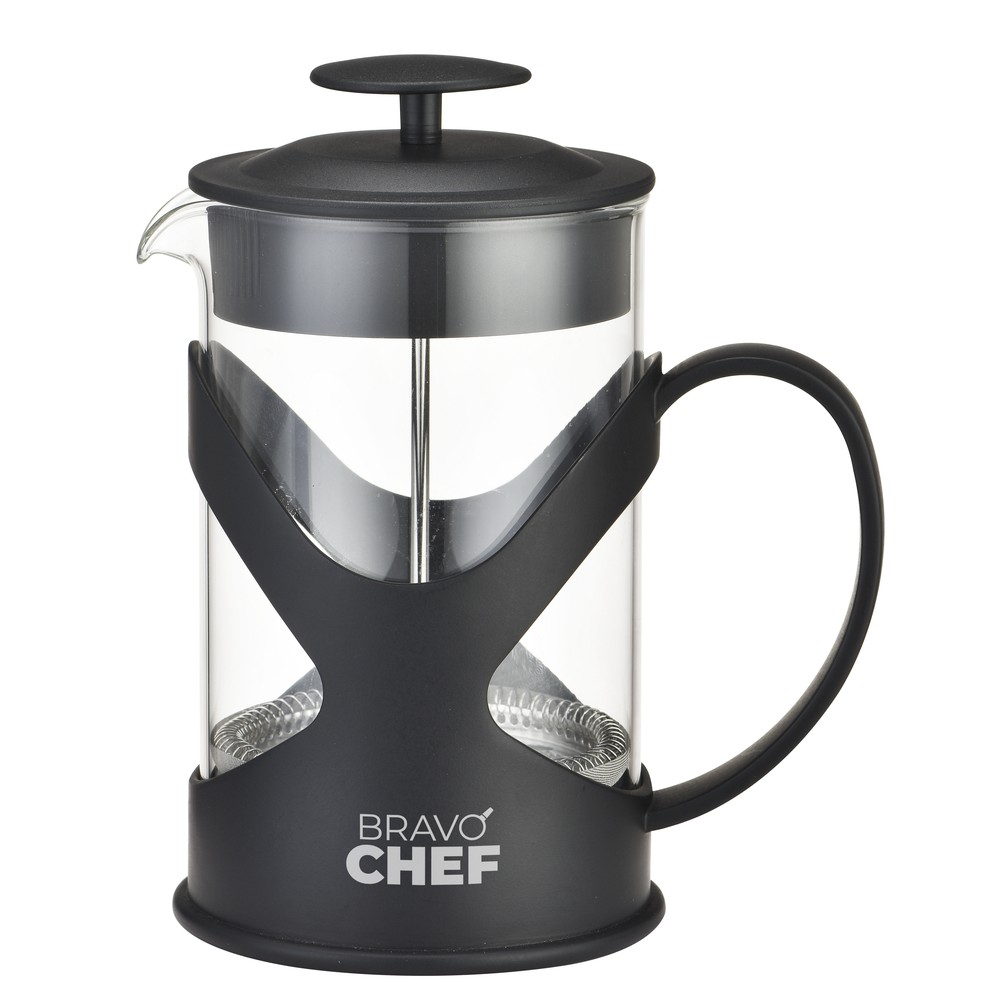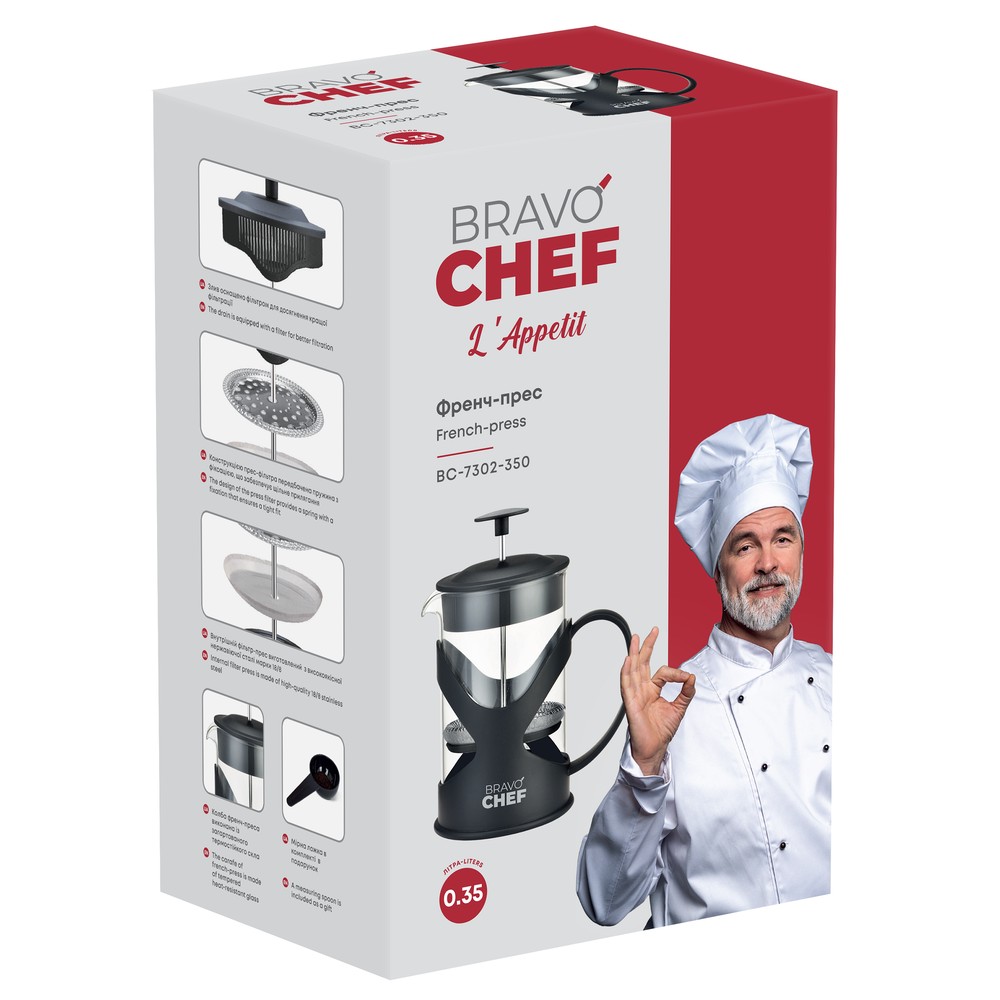 Френч-прес L`Appetit Об’єм: 0.35 мл Матеріал: пластик/загартоване скло/нержавіюча сталь Колір: чорнийBRAVO CHEF – це посуд, який дає безмежні можливості втілити будь-які вишукані ідеї щодо приготування страв на власній кухні, відчути себе справжнім Шеф-кухарем…