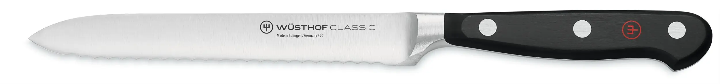 1040101614 ніж для нарізки (ковбасний) 14 см у картонній упаковці CLASSIC Wuesthof має вишуканий дизайн та буде гарно виглядати на будь який кухні. Фахівці компанії Wusthof при проектуванні урахували всі запити користувачів та зробили дійсно якісний продукт. Анатомічна конструкція та функціонал спрощує процес користуванням.