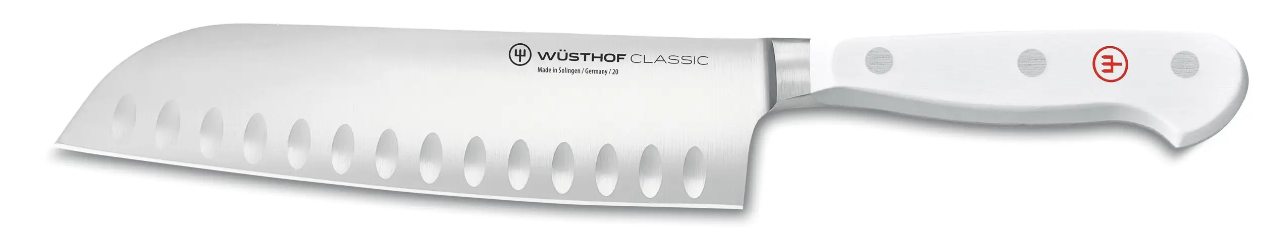 1040231317 Ніж-сантоку 17 см у картонній упаковці Wusthof Classic White має вишуканий дизайн та буде гарно виглядати на будь який кухні. Фахівці компанії Wusthof при проектуванні урахували всі запити користувачів та зробили дійсно якісний продукт. Анатомічна конструкція та функціонал спрощує процес користуванням.