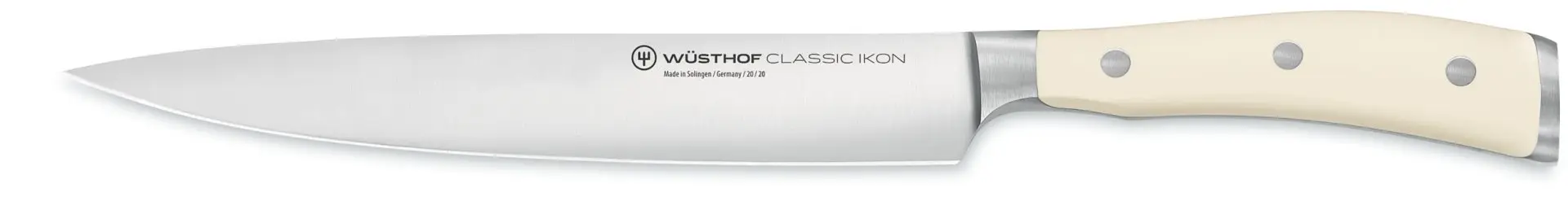 1040430720 ніж для нарізки 20 см у картонній упаковці Wuesthof CLASSIC IKON CREME має вишуканий дизайн та буде гарно виглядати на будь який кухні. Фахівці компанії Wusthof при проектуванні урахували всі запити користувачів та зробили дійсно якісний продукт. Анатомічна конструкція та функціонал спрощує процес користуванням.