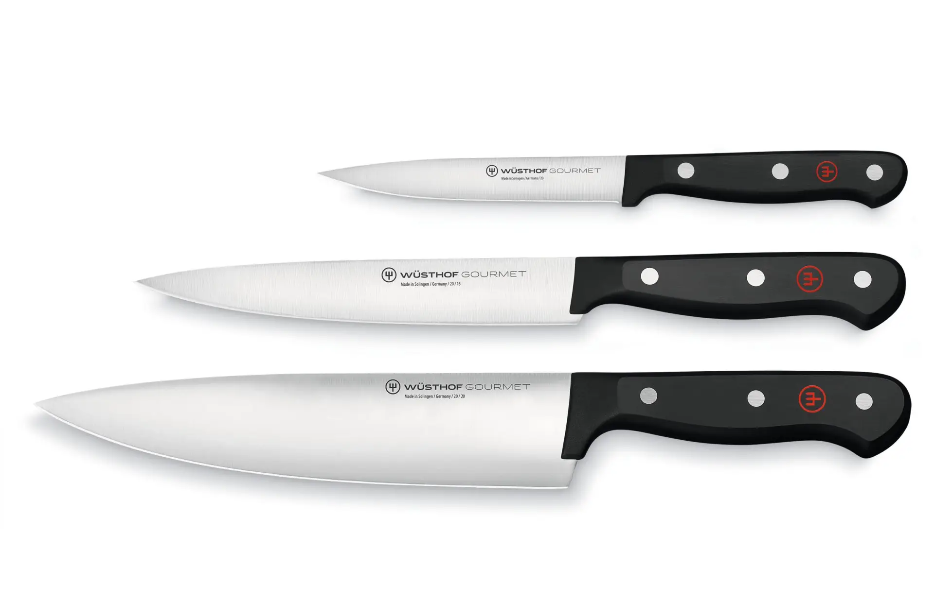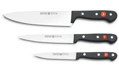 Ножі Wusthof GOURMET створені з тієї ж сталі (X50CrMoV15), що й ковані ножі. Форма ножа вирізається лазарем із одного шматка прокатної сталі. В результаті ніж виходить дуже гострим, зручним у використанні і легшим, ніж кований аналог, але в той же час менш дорогими. Ці ножі легко заточуються, довго зберігають заточування. Ножі Gourmet має ручку з потрійною клепкою. Кухарський ніж: довжина 20 см Універсальний ніж: довжина 16 см Універсальний ніж: довжина 12 см