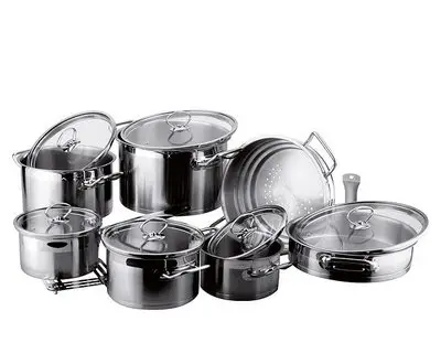 Набір посуду VINZER UNIVERSUM має строгий та елегантний дизайн, виготовлений із високоякісної нержавіючої сталі FERRINOX® 18/10 Полірування: дзеркальне. Має властивості термоакумулюючого дна. Швидка акумуляція тепла та тривале його збереження. Технологія кріплення дна "Impact Bonding". Завдяки точно розрахованій товщині сталі ручки не нагріваються. Кріплення ручок точковою пайкою. Кришки виготовлені з термостійкого скла з отвором для випуску пари. Запакований у подарунковій коробці. Підходить для всіх видів плит, зокрема індукційні. Можна мити в посудомийній машині. Набір посуду VINZER UNIVERSUM складається з 14 предметів: Каструля з кришкою 1,8 л 16 см, Каструля з кришкою 2,6 л 18 см, Ківш з кришкою 1,8 л 16 см, Каструля з кришкою 20 см 3,7 л, Кастру з кришкою 24 см 6,5 л, Сотейник з кришкою 16 см 1,8 л, Сковорода з кришкою 24 см, Універсальна пароварка 18/20/24 см, Металева підставка