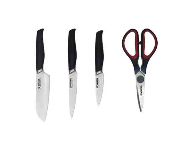Набір ножів Vinzer ASAHI 4 предмета артикул 50128. Набір ножів Vinzer ASAHI виготовлений із високовуглецевої сталі 1.4028 / X30Cr13, клиноподібний переріз леза, завдяки чому надовго зберігається гострота лез. Ергономічні бакелітові ручки. Набір включає: ніж сантоку з довжиною леза 12,7 см і товщиною 1,5 мм; ніж універсальний з довжиною леза 12,7 см та товщиною 2,5 мм.; ніж для овочів із довжиною леза 8,9 см. та товщиною 2,5 мм.; ножиці кухонні. Можна мити у посудомийній машині.