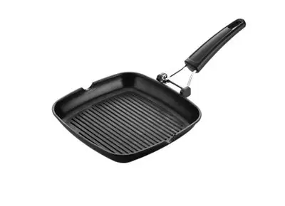 Антипригарне покриття Teflon Classic™. Спеціальне рифлене дно дозволяє готувати м`ясо, рибу, домашні ковбаски. Продукти виходять з характерними смужками-гриль, а також більш дієтичними за рахунок стікання зайвого жиру. Складна ручка для зручного зберігання. Розміри: 28 см х 28 см.