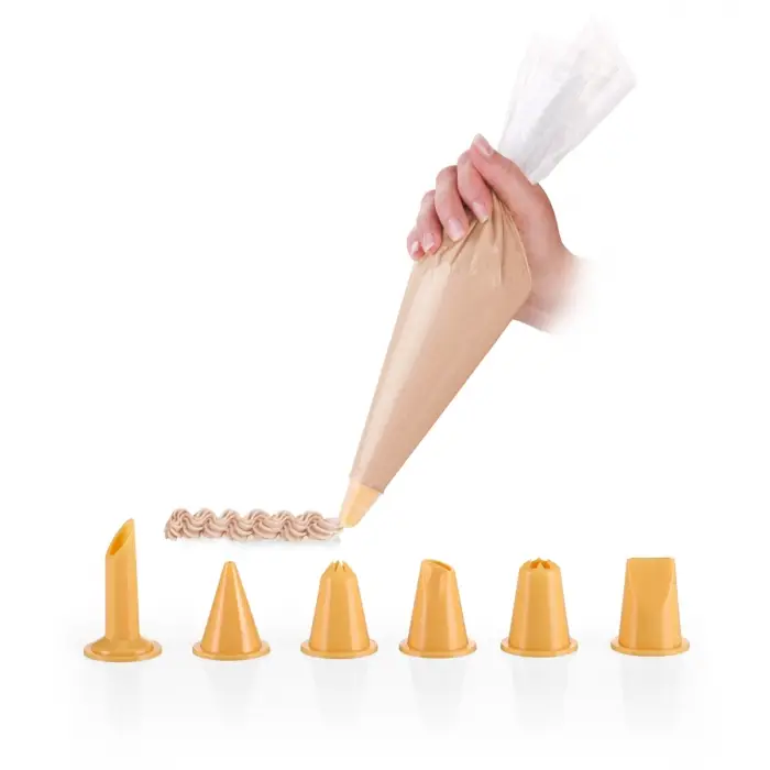 630470 Мішечок для прикраси страв DELICIA 30 см, 10шт., 6 насадок має вишуканий дизайн та буде гарно виглядати на будь який кухні. Фахівці компанії tescoma при проектуванні урахували всі запити користувачів та зробили дійсно якісний продукт. Анатомічна конструкція та функціонал спрощує процес користуванням.