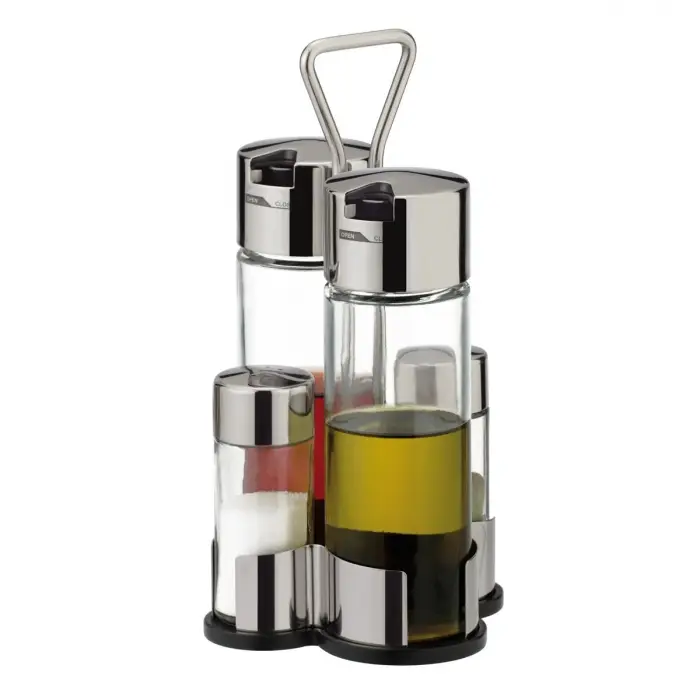 650354 Набір масло-оцет-сіль-перець CLUB . Tescoma має вишуканий дизайн та буде гарно виглядати на будь який кухні. Фахівці компанії tescoma при проектуванні урахували всі запити користувачів та зробили дійсно якісний продукт. Анатомічна конструкція та функціонал спрощує процес користуванням.