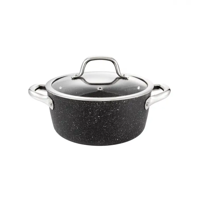 Розкішний посуд з першокласним антипригарним покриттям, що підходить для металевого кухонного начиння. На антипригарній поверхні з властивостями неполірованого натурального каменю страви не пригорають, готуються швидко та рівномірно. Міцна кришка зі скла та нержавіючої сталі з отвором для пари, водонепроникні ручки з нержавіючої сталі та індукційне дно. Підходить для всіх типів плит та духовок (з кришкою макс. 200 ° C). Можна мити в посудомийній машині.