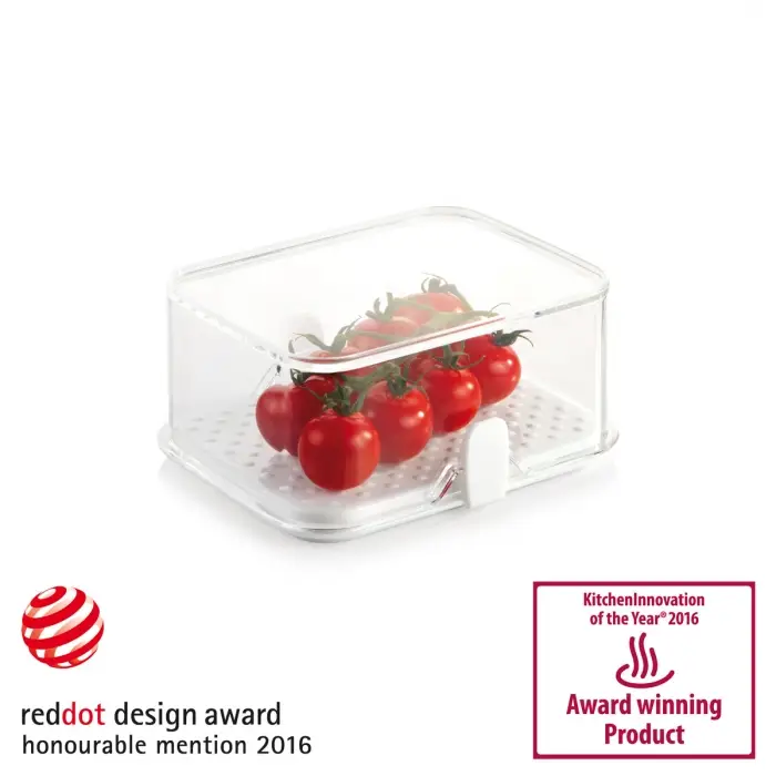 Виготовлений із високоякісного медичного пластику. Чудово підходить для гігієнічного зберігання їжі в холодильнику. Використовуваний матеріал дуже високої якості і ніяк не впливає на якість їжі, навіть при тривалому зберіганні. Обидві сторони дна з виступами проти змочування їжі та підвищеними краями, що захищає від витікання соку. Контейнери можна ставити один на одного, що значно заощаджує місце в холодильнику. Поставляється з 2 запасними наборами клямок червоного та зеленого кольору. Можна мити в посудомийній машині.