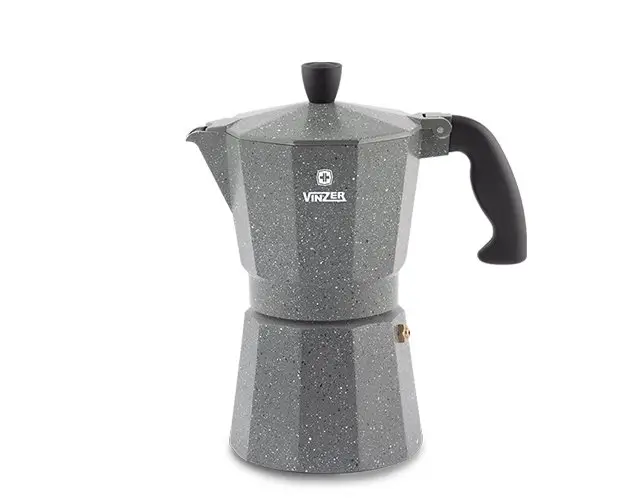 89399 Гейзерна кавоварка Vinzer Moka Granito на 9 чашок має вишуканий дизайн та буде гарно виглядати на будь який кухні. Фахівці компанії Vinzer при проектуванні урахували всі запити користувачів та зробили дійсно якісний продукт. Анатомічна конструкція та функціонал спрощує процес користуванням.