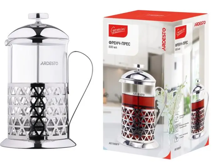AR1908FP Френч-прес Ardesto Gemini, 800 мл, нержавіюча сталь, скло має вишуканий дизайн та буде гарно виглядати на будь який кухні. Фахівці компанії ARDESTO при проектуванні урахували всі запити користувачів та зробили дійсно якісний продукт. Анатомічна конструкція та функціонал спрощує процес користуванням.