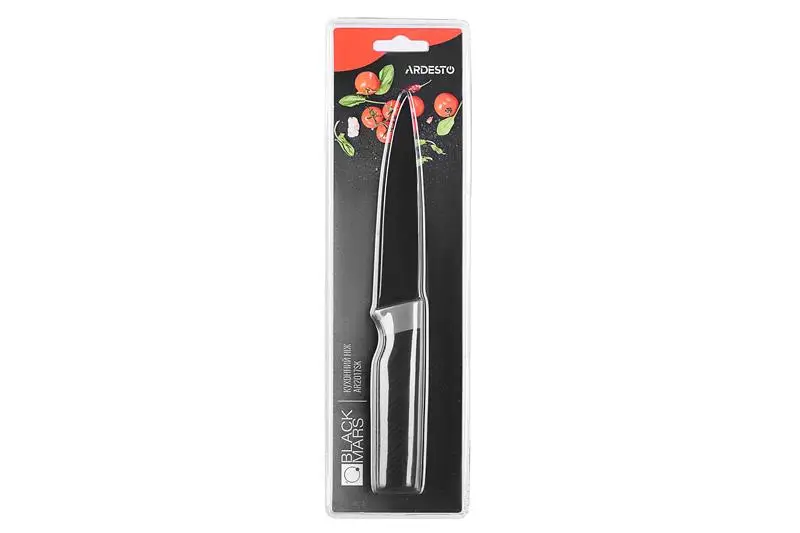AR2017SK Кухонний ніж Ardesto Black Mars, 22,8 см, чорний, нерж. сталь, пластик має вишуканий дизайн та буде гарно виглядати на будь який кухні. Фахівці компанії ARDESTO при проектуванні урахували всі запити користувачів та зробили дійсно якісний продукт. Анатомічна конструкція та функціонал спрощує процес користуванням.