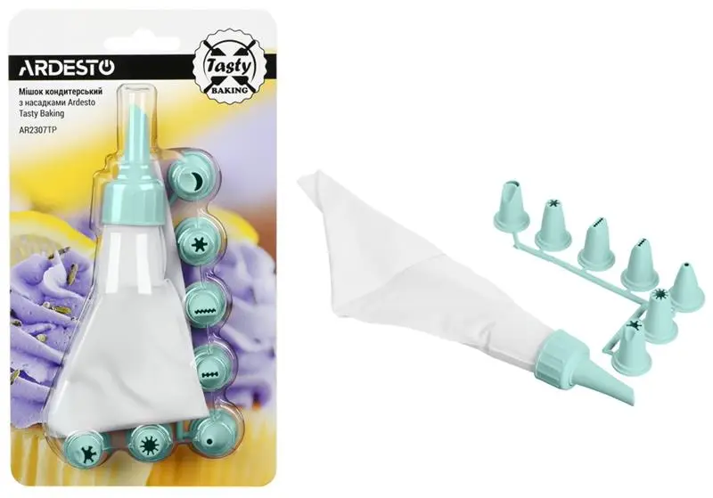 AR2307TP Мішок кондитерський з насадками Ardesto Tasty baking, блакитний тифані, пластик має вишуканий дизайн та буде гарно виглядати на будь який кухні. Фахівці компанії ARDESTO при проектуванні урахували всі запити користувачів та зробили дійсно якісний продукт. Анатомічна конструкція та функціонал спрощує процес користуванням.