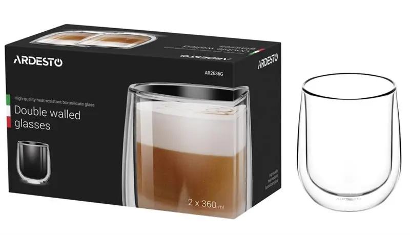 AR2636G Набір чашок Ardesto з подвійними стінками для латте, 360 мл, 2 од., борошикатне скло