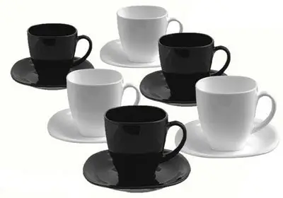 Матеріал:склокераміка. Витримує перепади температур. Підходить для мікрохвильової печі. Можна мити в посудомийній машині. У наборі: чашка 220 мл біла – 3 шт; чашка 220 мл чорна – 3 шт; блюдце біле – 3 шт; блюдце чорне – 3 шт.