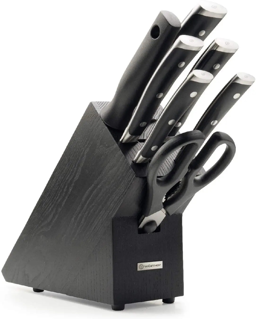 Набір ножів від німецького бренду Wusthof виготовлений із нержавіючої сталі. Класичний дизайн лез продуманий для щоденного використання. Зручні ручки для щоденного використання без шкоди для дизайну, де домінують прямі лінії з контрастами за формою та кольором. Переваги: Серія «Classic» – широкий вибір у класичному стилі особливий склад легованої сталі, з додаванням вуглецю, хрому, молібдену та ванадію Твердість за шкалою Роквелла 56-58 HRC Лазерний контроль заточування Двостороннє симетричне заточення Кут заточування 20 градусів /> Безшовне з`єднання рукоятки та леза Безпечний запобіжник для рук Матеріал рукоятки з нековзного та удароміцного пластику з трьома круглими заклепками Комплектація: Ніж для очищення овочів: довжина 7 см /> Ніж для овочів: довжина 9 см Ніж універсальний: довжина 16 см Ніж кухарський: довжина 20 см Ніж для хліба: довжина 20 см Мусат: довжина 23 см< br /> Ножиці Дерев`яний блок Wusthof Ikon – ікона німецького стилю від Wusthof, ножі Icon відрізняються унікальною естетикою них форм лез. Лінія, включає в себе відразу три колекції: Ikon, Classic Ikon та Ikon Cream White. Вони відрізняються кольором та матеріалом рукояток. Накладки на рукояті серії Classic Ikon – синтетичні, чорного кольору. Конструкція «фул-танг» забезпечує максимальну зручність та ідеальний баланс цих ножів. Заточення за технологією PETEC та спеціальна конструкція клинків забезпечують найвищу функціональність цих ножів. На торці рукояті вибивається логотип Wusthof – тризуб. У колекцію входить понад 20 моделей ножів для будь-якого виду кулінарної діяльності. Ножі продаються як поштучно, так і у вигляді подарункових наборів та ножових боксів. Ножі лінії Ikon стануть чудовим помічником на будь-якій кухні, а також дуже приємним та корисним подарунком. Ціна на ножі в колекціях Ikon досить висока, особливо на ножі Wusthof Ikon, але незвичайний дизайн, дорогі матеріали, чудова якість, зручність та довічна гарантія стануть приводом задуматися про придбання саме цих ножів.