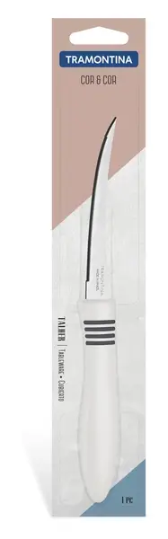 Набір з 2 кухонних ножів для овочів серії COR COR. Вироби оснащені гострим лезом і відмінно підійдуть для зняття шкірки і нарізки плодів. Лезо виготовлено із загартованої нержавіючої сталі, що дозволяє йому довго залишатися гострим при експлуатації. Набір ножів Tramontina Cor Cor стане ідеальним варіантом для нарізування і чищення овочів, фруктів та інших продуктів